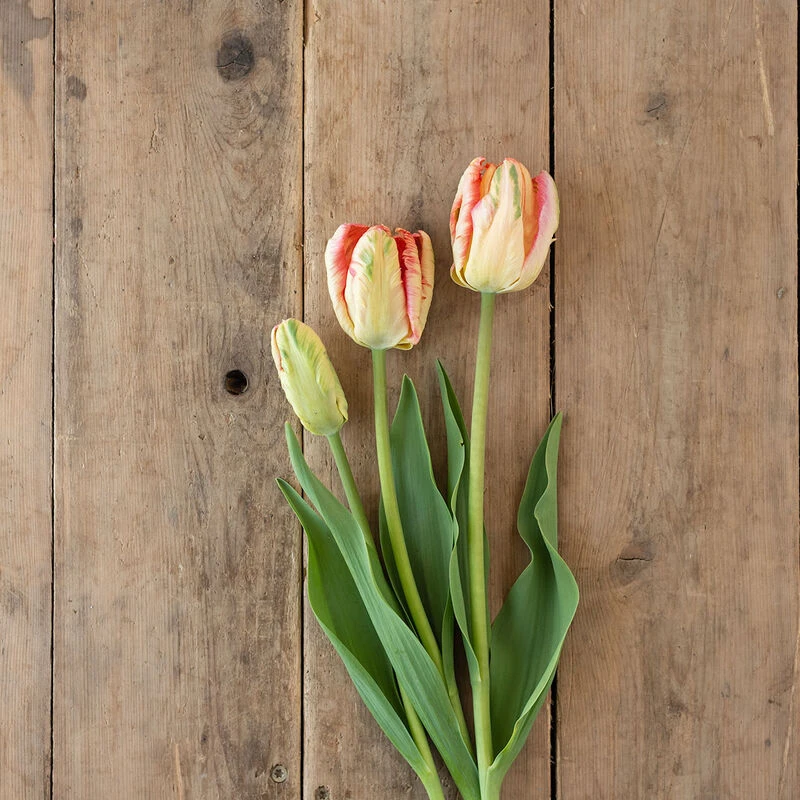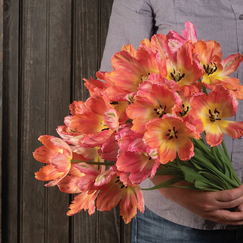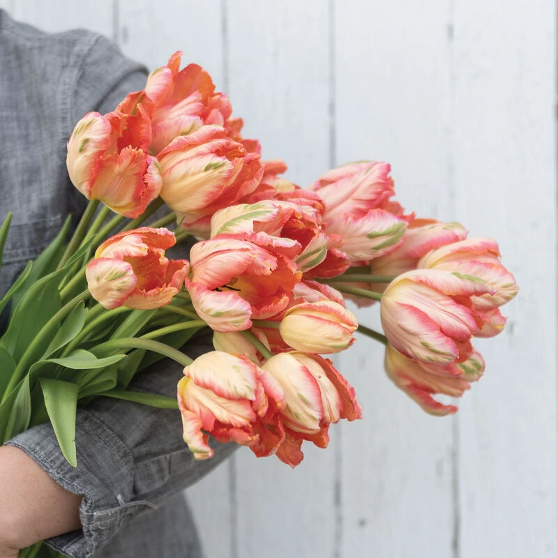 Beautiful peachy-pink tones with green and yellow on the outer petals. Pink tones increasingly develop as the blooms mature. Taller and more uniform than Salmon Parrot, with more deeply scalloped petals. In color, Apricot Parrot is more coral-pink than Salmon Parrot, which is a shade or two closer to orange-salmon. The 2โ3″ blooms are very lightly fragrant. NOTE: Bulbs do not come pre-chilled; if growing in hardiness Zones 8โ10, see growing information (below) for pre-chilling instructions.