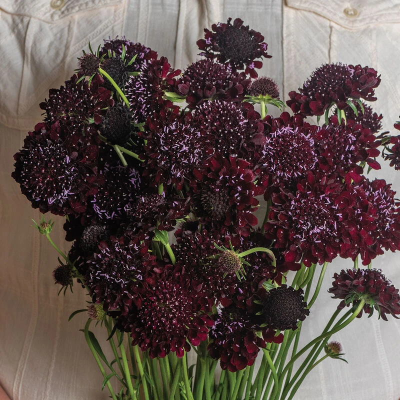 Almost black, 1 1/2โ2 1/2″ blooms stand tall on strong, slender stems. Also known as mourningbride. USDA Certified Organic.