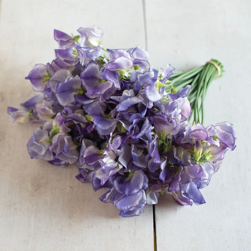 From the Spencer Series. Lavender blue streaks and flecks throughout and lining the slightly ruffled petal edge. Reminiscent of sea glass. Plants produce 3โ4 blooms per 9โ12″ stem. Mildly fragrant. NOTE: Spencer Series sweet peas are known as late-flowering because they require at least 12 hours of daylight, unlike more modern sweet pea varieties bred for winter production, which may require only 10โ11 hours of daylight.