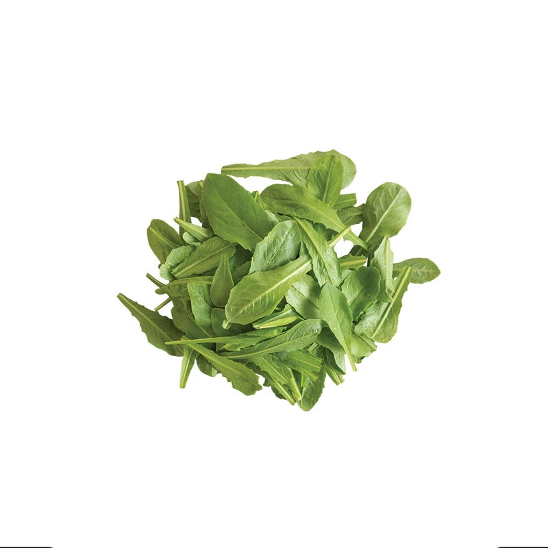 Uniform strain. At baby-leaf stage, leaves are narrow with subtle spikes along the margins and a thin petiole. At full size, leaves are long, deep green, slender, and deeply cut with white midribs.