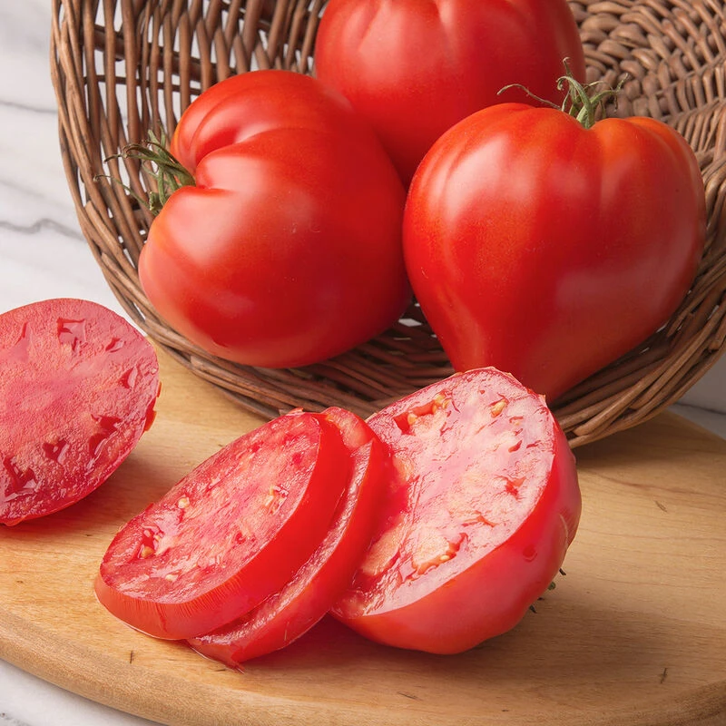 Matures early with heavy yields of 8-14 oz. beautiful, heart-shaped fruit. Improved disease resistance over true heirlooms of similar type. Possesses excellent eating quality that is uncommon among modern hybrid greenhouse tomatoes. Cauralina’s fruit has a meaty texture with little gel, making it perfect for sauce, canning, and salsa; but it also has a full, rich flavor great for fresh eating. Produces a tall plant with wispy foliage and huge fruit clusters. NOTES: 1) Prune to single leader. 2) Prune off the first flower, or “king flower,” to avoid producing abnormally large king fruit. Indeterminate.