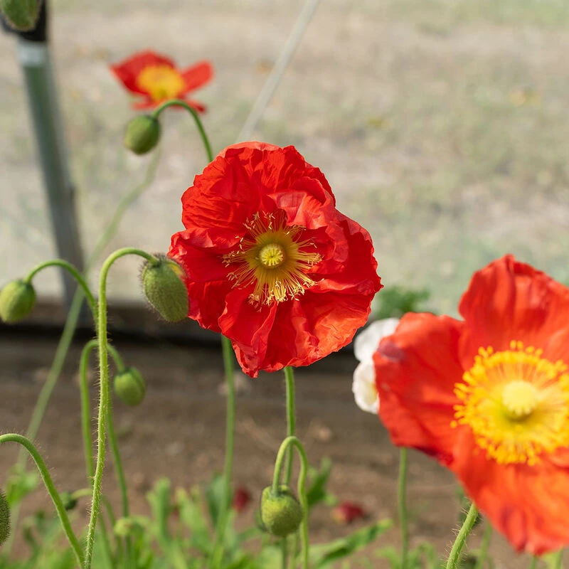 Cheerful scarlet-red, 3โ5″ blooms are borne on sturdy, straight, 12โ20″ stems. Productive plants produce uniform, crinkled, cup-shaped blooms that sparkle and float above clumps of soft, gray-green foliage. Lightly fragrant.