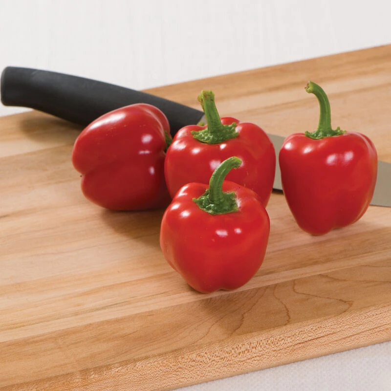 Fruits are blocky to slightly pointed, snack size, avg. 2″ X 1 3/4″, and are particularly sweet when red. Large, well-branched plants protect the fruits from sunscald. Bred by Janika Eckert. USDA Certified Organic.