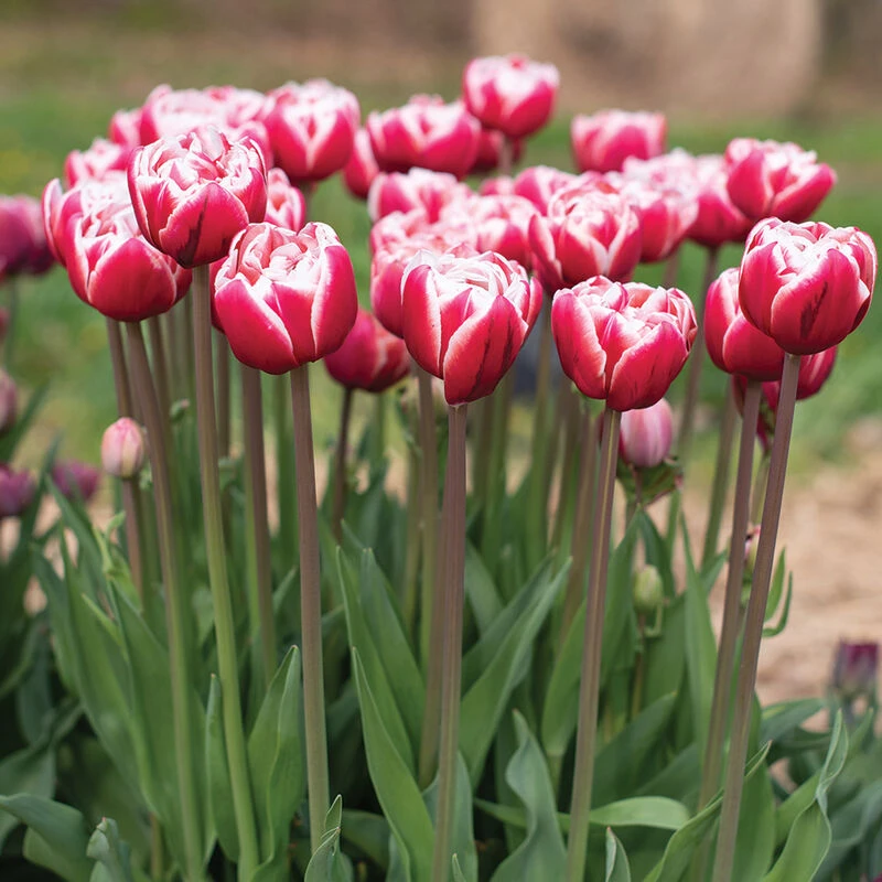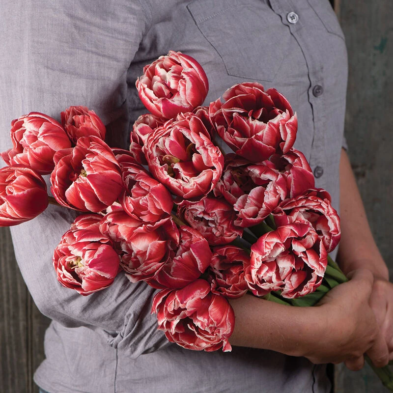 Tall, sturdy, uniform stems. Deep candy apple-red petals with feathery white edges. The 2 1/2โ3″ blooms are highly uniform. NOTE: Bulbs do not come pre-chilled; if growing in hardiness Zones 8โ10, see growing information (below) for pre-chilling instructions.