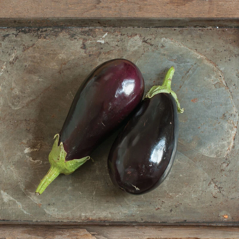 Very glossy, uniform, black to purple fruits are 6-7″ long by 3-4″ in diameter. Strong plants produce early, firm fruits. High yielding, even in the North. Green calyx.
