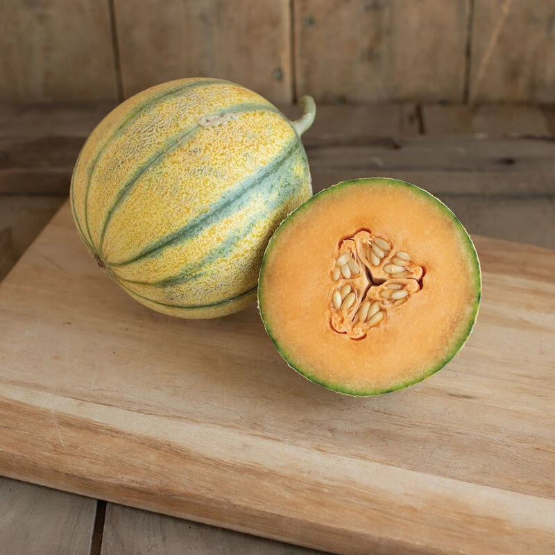 Succulent and sweet, this hybrid version of the heirloom ‘Petit Gris de Rennes’ looks and tastes like the French original but is protected by modern disease resistance. Unique greenish-yellow, green-sutured rind attracts attention, as does the intoxicating scent. Creamy and smoothโpractically melts in your mouth! The sweetness is accented with hints of exotic spice. Can be cut from the vigorous, healthy vines when skin yellows and rind gives slightly from your touch.