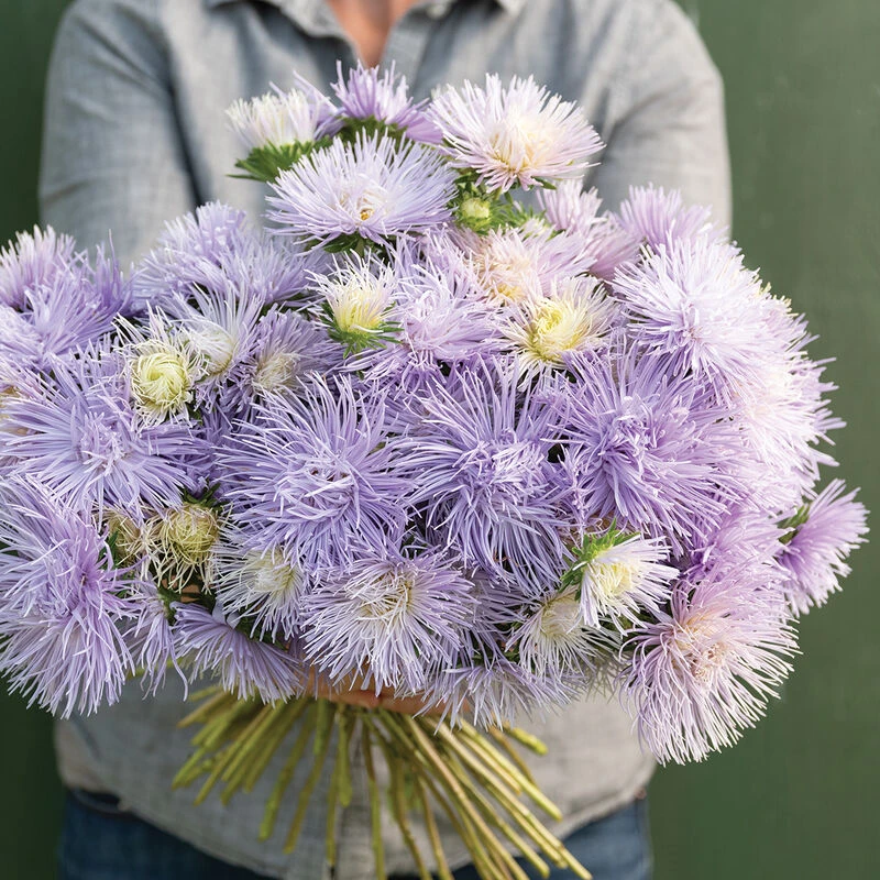 4โ6″ wide, silvery-lilac blooms open with a creamy colored center, darkening to lilac-blue as blooms mature. Long, sturdy stems. Easy to harvest due to the well-branched plant’s open and airy habit. Similar to the Valkyrie series in general performance and plant habit. Long vase life. Also known as summer aster.