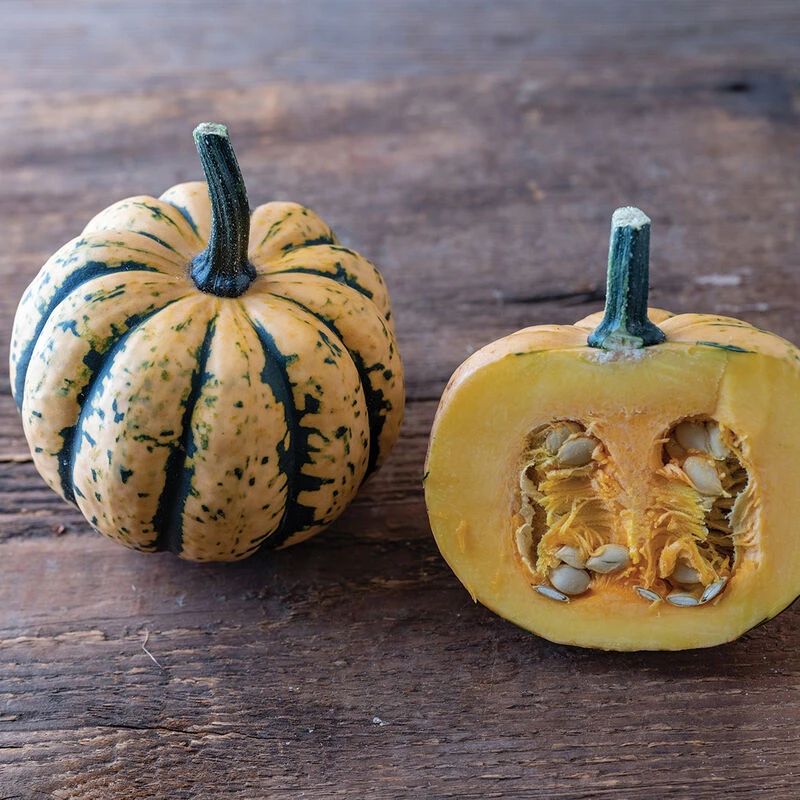 Impressive yields of eye-catching variegated fruit, plus strong agronomic qualities. A dramatic improvement over Sweet Dumpling. Fruits turn caramelly-bronze at peak ripeness. Avg. weight: 1–2 lb. Bred by Dr. Lindsay Wyatt at Johnny’s. Our thanks to UNH for their help in developing this variety.