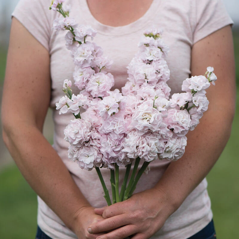 Early single-stem, or column-type stock in a highly uniform series for one-cut harvest. Aptly named for strong, straight, rigid stems. Iron performed well in our spring, early summer, and fall trials. Selectable for doubles and 55% double without selection. Compared to Katz, Iron is slightly later to flower, and has somewhat shorter and thicker stems. Tightly spaced florets on the flower spike make for compact 1 1/2โ2″, soft blush/rose pink blooms with a full appearance. NOTE: This variety produces one flowering stem per plant. Pinching is not advisable as it will terminate flowering.