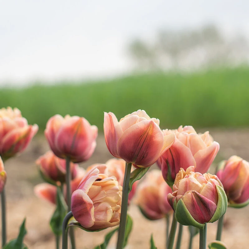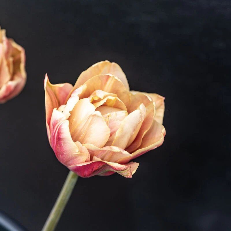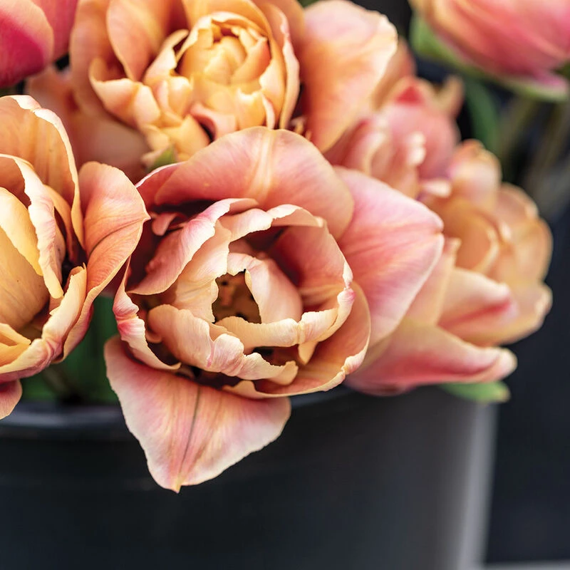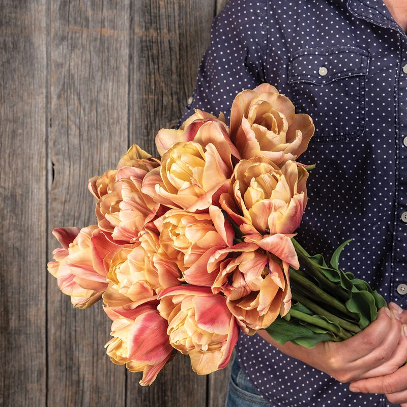 Popular with designers and a favorite in our trials. Beautiful, fully double 2 1/2″ blooms with thick layers for a lush look. Varied color tones make it a versatile choice for pairing with many palettes. The base petal color ranges from pale apricot to a creamy caramel and the outer petals are brushed with a deep, dusky rose. Sturdy stems for easier bouquet work. NOTE: Bulbs do not come pre-chilled; if growing in hardiness Zones 8–10, see growing information (below) for pre-chilling instructions.