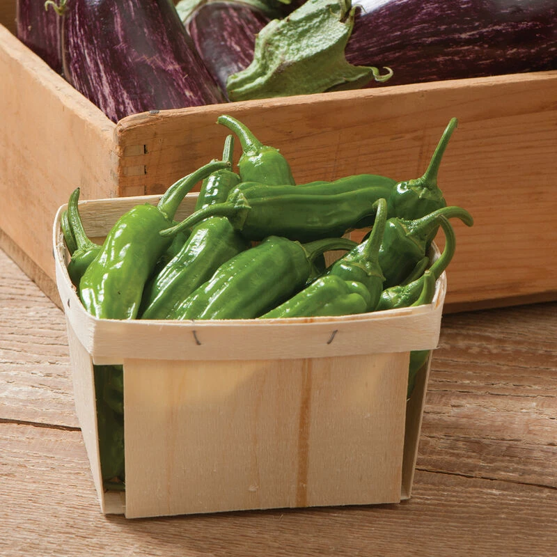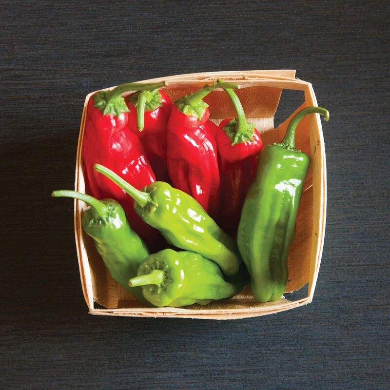 Avg. 3 1/2-4″ heavily wrinkled fruits are thin walled, mild (no heat) when green and slightly sweet when red. Popular in Japan where its thin walls make it particularly suitable for tempura. Also very good roasted, in stir fries, or sautรฉs. In Asia, fruits are always cooked green but they also may be used red. Thinly sliced, the red fruits are excellent in salads and coleslaw. Large, upright plants produce good yields over an extended harvest period.