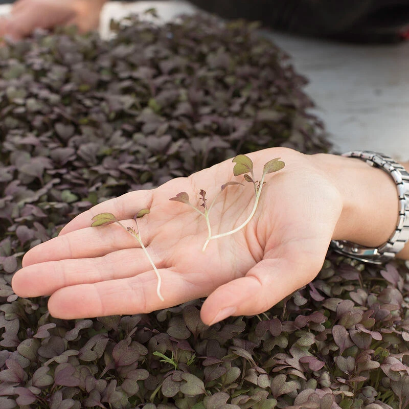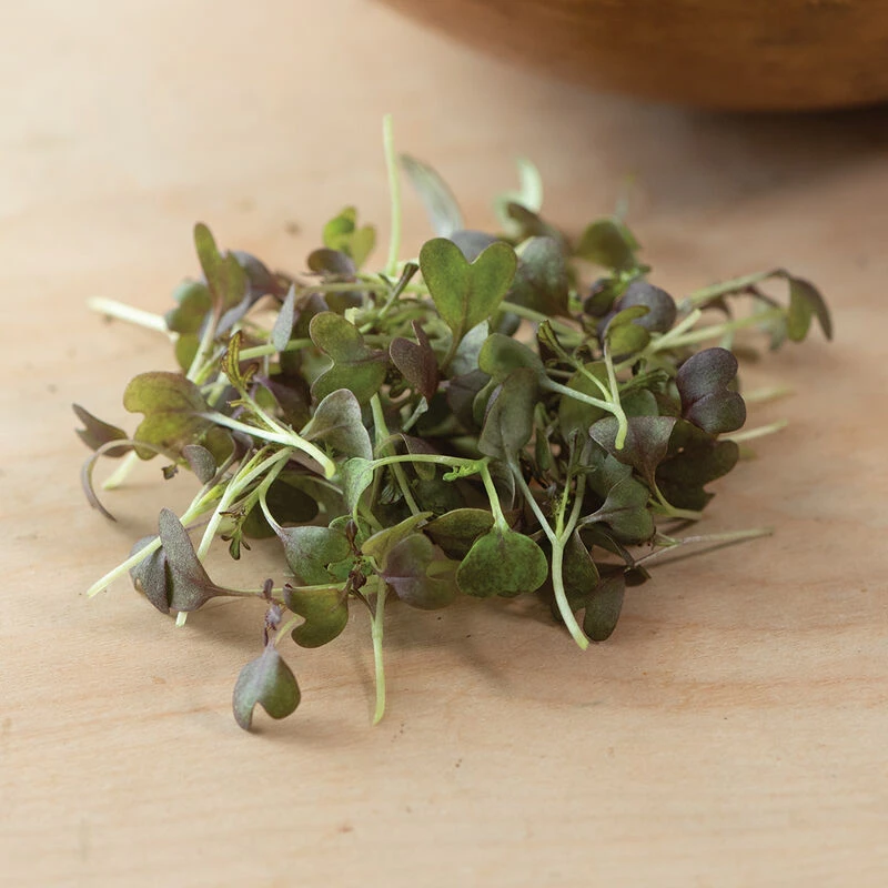Improved dark purple variety with light green stems and spicy flavor. Based on our yield trial, we recommend seeding 9.5 gm per tray at approx. 3 flats per oz of seed. Avg. days to maturity was 14.5 days when harvested at the first true leaf (as opposed to cotyledon) stage.