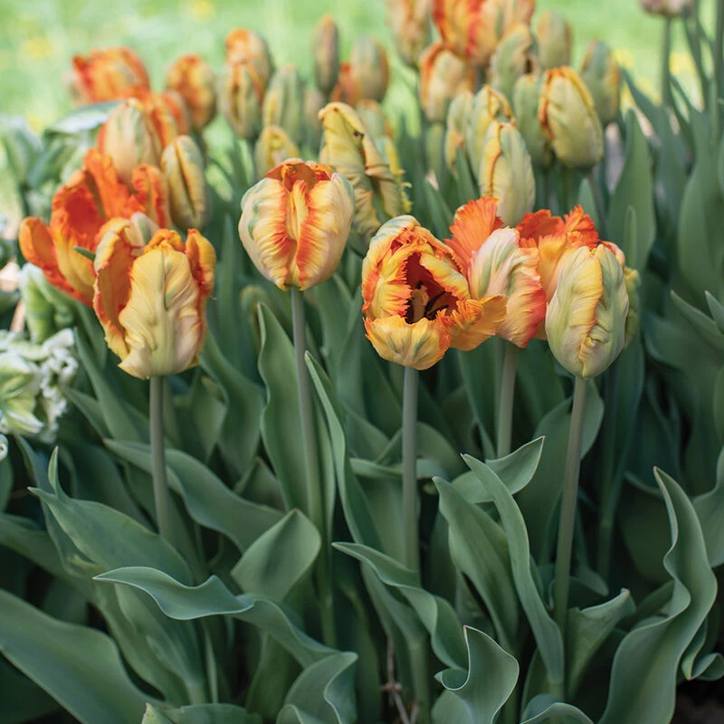 3โ3 1/2″ blooms with striking colors and intricate patterning. Petals in apricot and orange hues with gold, green, and cream shades that appear painted on in delicate detail. Feathery petals are nicely scalloped and crimped. NOTE: Bulbs do not come pre-chilled; if growing in hardiness Zones 8โ10, see growing information (below) for pre-chilling instructions.