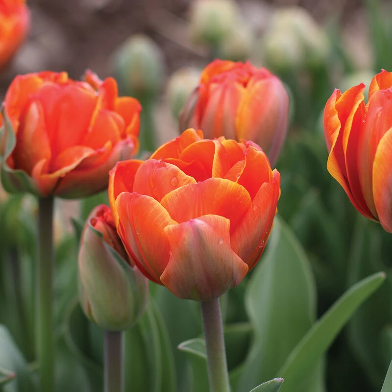 Striking orange blooms in shades of coral, orange, and gold with hints of purple and green on the outer petals. Long, slender green-and-pink sepals frame and add interest to vivid blooms. Mildly fragrant, 3″ tall blooms. Strong stems, some producing multiple blooms per stem. Named for a Dutch holiday where brilliant orange attire is customary among revelers. NOTE: Bulbs do not come pre-chilled; if growing in hardiness Zones 8โ10, see growing information (below) for pre-chilling instructions.