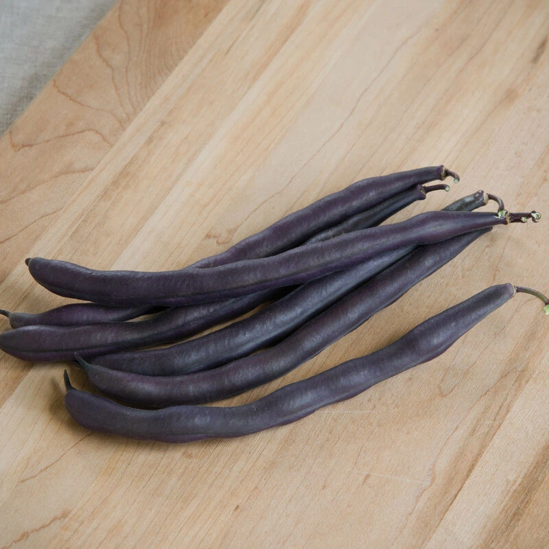 The brilliant purple, 5โ5 1/2″ pods are eye-catching at market, easy to spot when harvesting, and add stunning color to salads when used raw. The pods do turn green when cooked. Upright plants are dark green with a purple tinge. Buff-colored seeds. Bush bean. USDA Certified Organic.