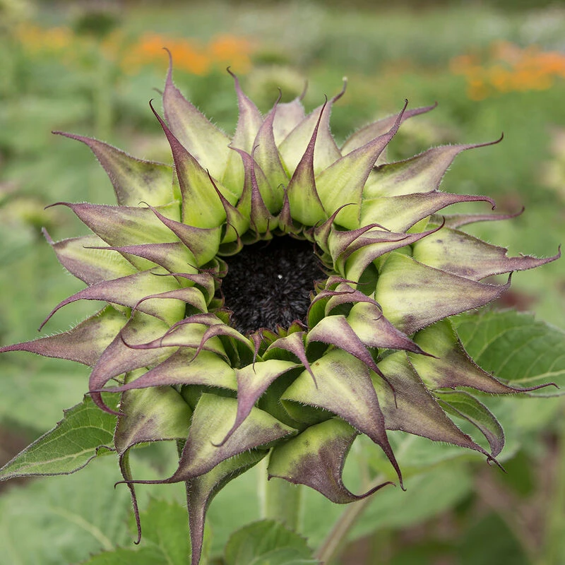 Fast-growing sunflowers produce sturdy, 3-4″ geometric flower heads for use as bouquet greenery. Petals are green at the center, fading to purple. Often, sunflower backs can be just as beautiful and interesting as the faces. To bring the “sunflower back” look to the forefront, American sunflower breeder Tom Heaton bred two innovative varieties (SunFill Green and SunFill Purple) with highly ornamental sepals that wrap the flower face, creating that look typically only found on the back of the flower. Sunflower heads produce very small and few petals, allowing for the calyx to cover the face of the bloom at harvest. Pollenless. Single stem. NOTE: Recommended for cutting only. If left in the field, small petals (which were hidden under the calyx) and large seedhead develop, altering the look of the flower.