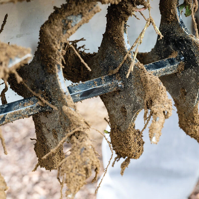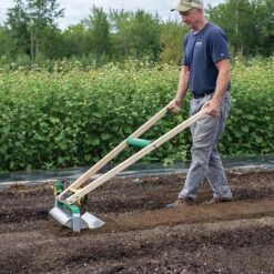 Since 2005 the Tilther has been the dependable standard in professional-grade bed preparation. Not to be confused with a tiller, the Tilther mixes and blends the top two inches of soil into a finely groomed and leveled tilth ready for planting. By targeting only the top two inches of soil, the Tilther leaves the soil structure and beneficial microbes intact, and does not bring dormant weed seeds to the surface. The new Tilther XT improves on the original with an all-new drive system that generates more torque and improved responsiveness. The powerful XT gear drive is easily controlled with a gentle squeeze of the trigger, which is shaped to a newly contoured set of handles. High-strength metal components with full-length ash wood handles. Minimal assembly required. Powered by a standard 18V drill (not included). Made in Maine.