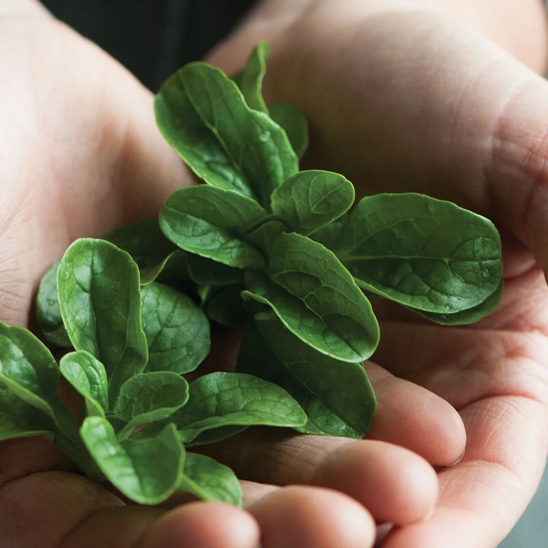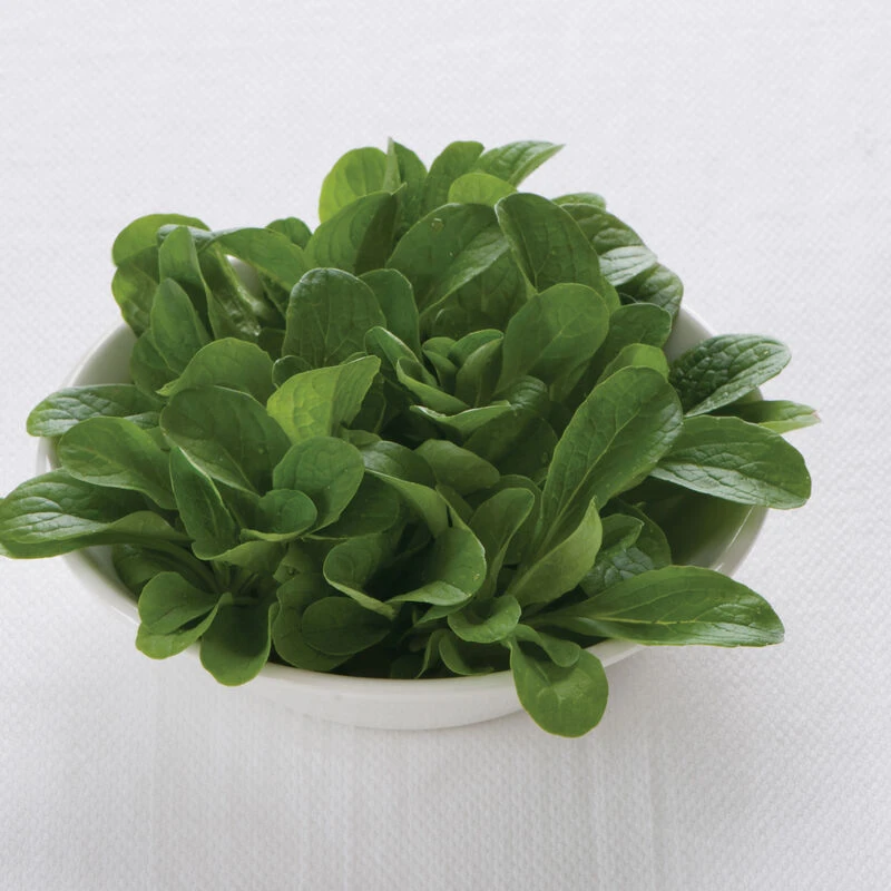 This versatile, vigorous, mildew-resistant variety is excellent at a time of year when greens become scarce. Long, oval, glossy green leaves form tight rosettes. Mild, slightly nutty flavor also reminiscent of roses. Also known as mรขche, lamb’s lettuce, and corn salad. Unsized seed.